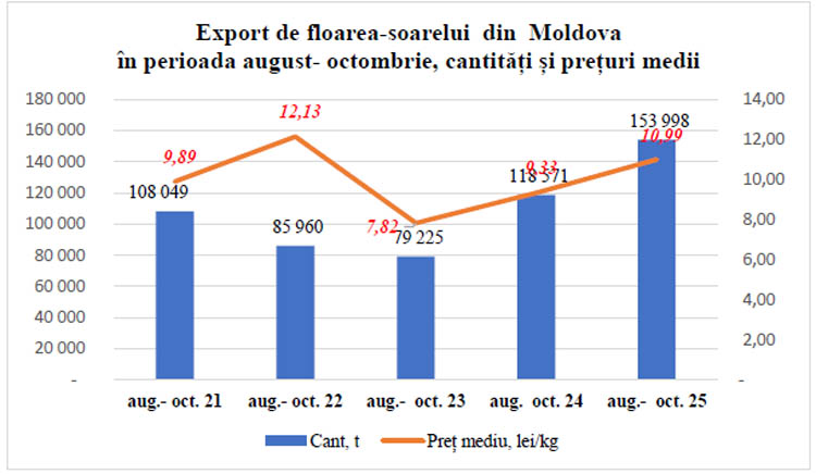 În total, în primele trei luni ale noului sezon agricol (august–octombrie 2025) au fost exportate 154.000 tone, în valoare de 1,692 miliarde lei, cu peste 50 la sută mai mult decât în perioada respectivă a anului trecut.