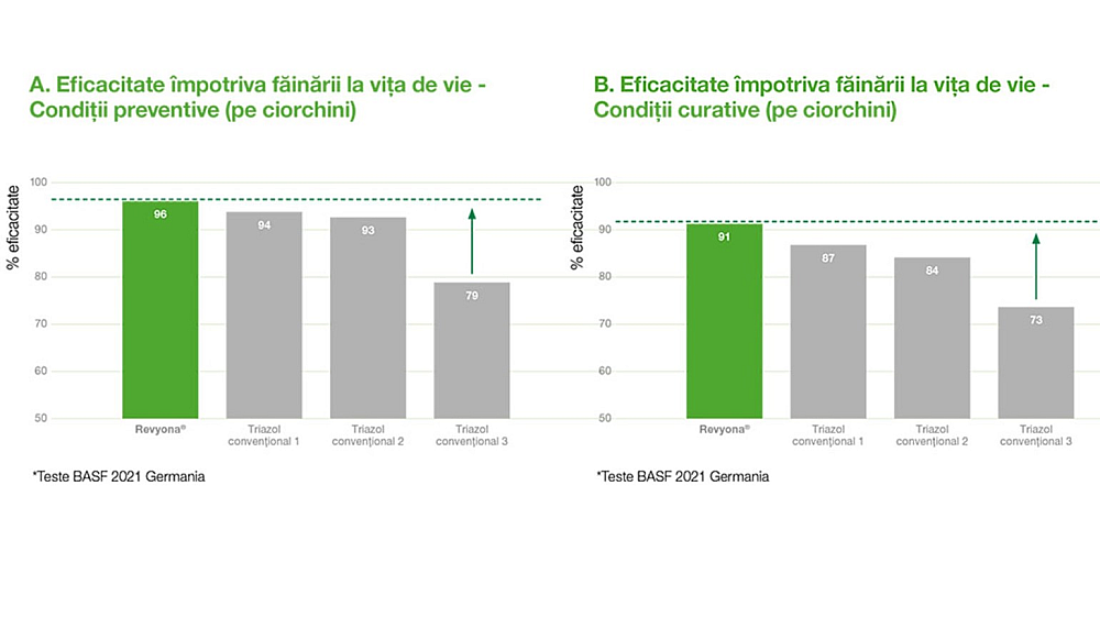 Aplicat la vița de vie pentru controlul făinării, Revyona® a dovedit în testele BASF că este un produs de încredere, ce asigură o calitate ridicată a strugurilor chiar și în condiții de creștere a populațiilor rezistente. Studiile efectuate în iulie 2020 au arătat un control mai bun cu 39% comparativ cu triazolii convenționali, inclusiv în condițiile unei populații de patogeni cu 35% mai rezistentă (mutația Y136F). Rezultatele au fost obținute la 6 săptămâni după ultima aplicare.