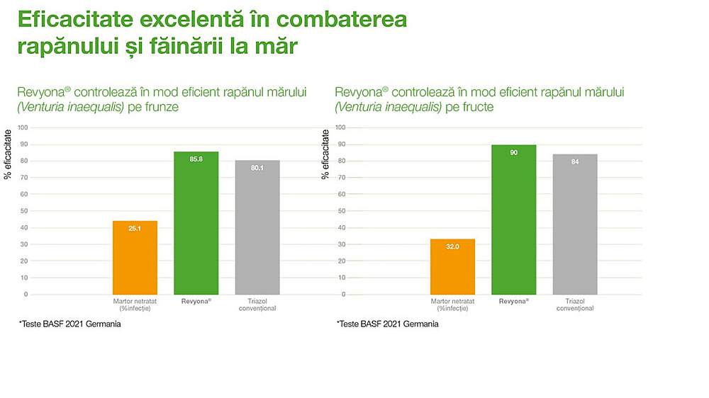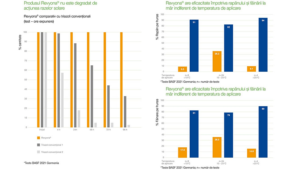 Eficacitatea produsului împotriva rapănului și făinării la măr se menține independent de temperatura de aplicare. Testele efectuate de BASF în 2021 în Germania au arătat că folosirea produsului Revyona®, în intervale diferite de temperatură, au redus apariția rapănului pe frunze până la 8,5%, spre deosebire de loturile martor unde procentul nu a scăzut sub 79%.